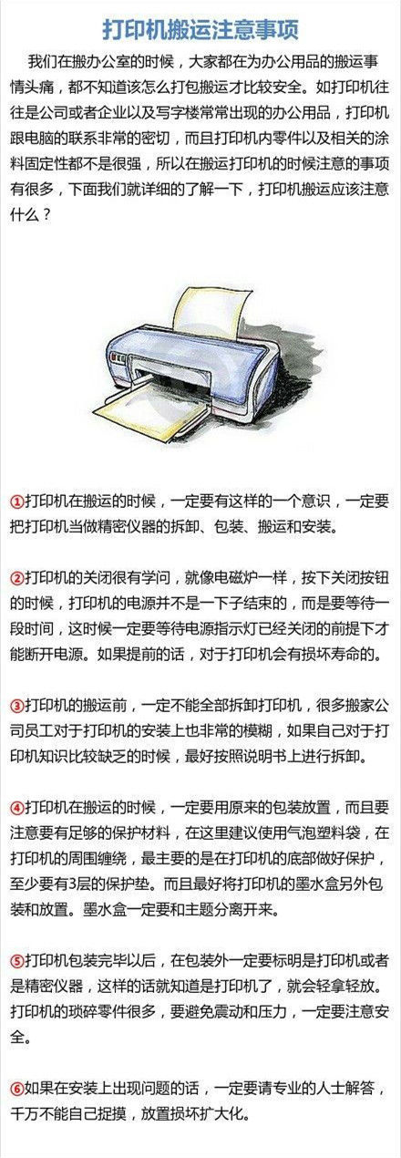 我们在搬办公室的时候,都在为办公用品的搬运事情头痛,不知道该怎么打包搬运才比较安全。如打印机往往是公司或企业以及写字楼常常出现的办公用品,打印机跟电脑的联系非常的密切,而且打印机内零件及相关的涂料固定性都不是很强,所以在搬运打印机的时候注意事项有很多,一起来了解下吧~
